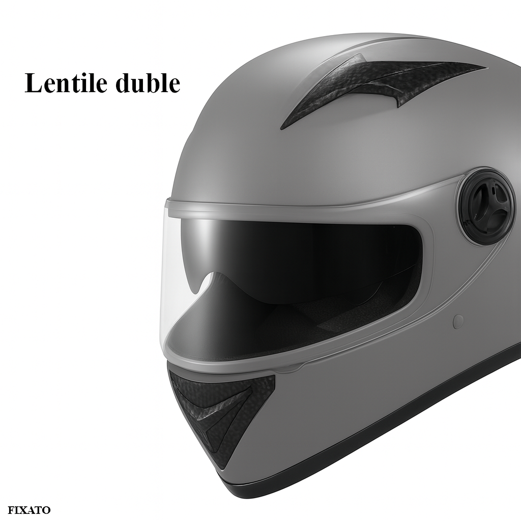 Casca este realizată din policarbonat ABS, oferind protecție și durabilitate. Dispune de vizieră dublă – lentilă exterioară transparentă și lentilă interioară fumurie cu protecție UV, ideală pentru condus în condiții de soare puternic.