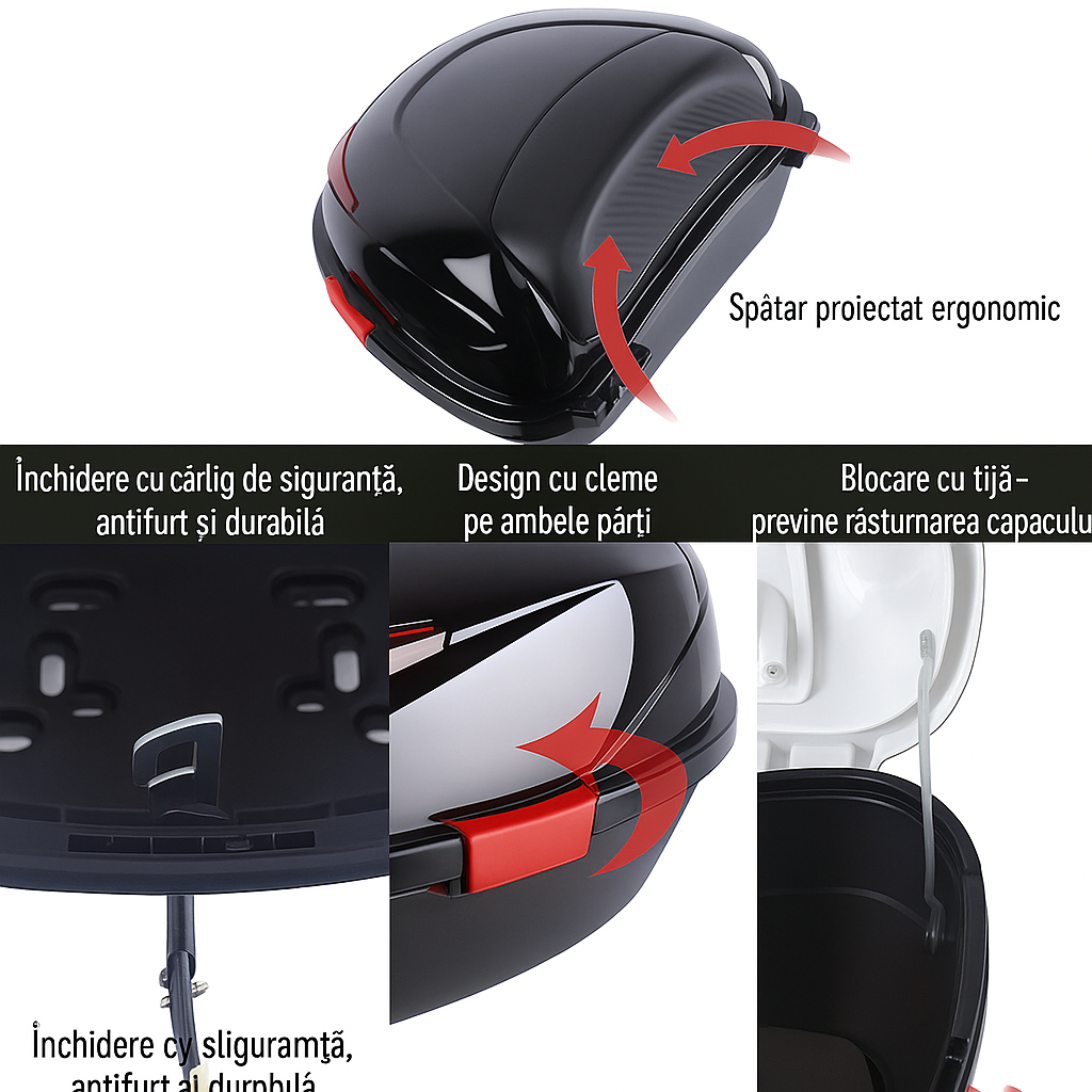 Cutia portbagaj pentru scuter și motocicletă este ideală pentru depozitarea în siguranță a echipamentelor și accesoriilor în timpul deplasărilor. Fabricată din material ABS rezistent la impact, oferă protecție excelentă împotriva intemperiilor și uzurii zilnice.